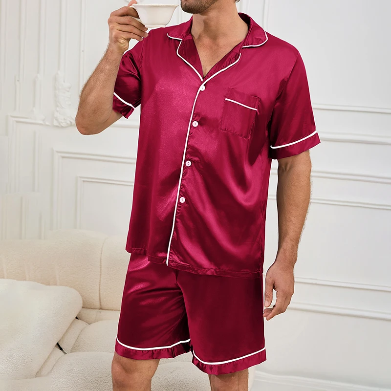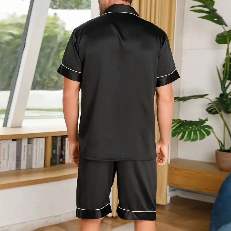 ↑Heren tweedelige pyjamaset zomer satijn casual comfortabele pyjama knoopzak shirt met korte mouwen en shorts vrijetijdskleding pyjama - TopDealBox
