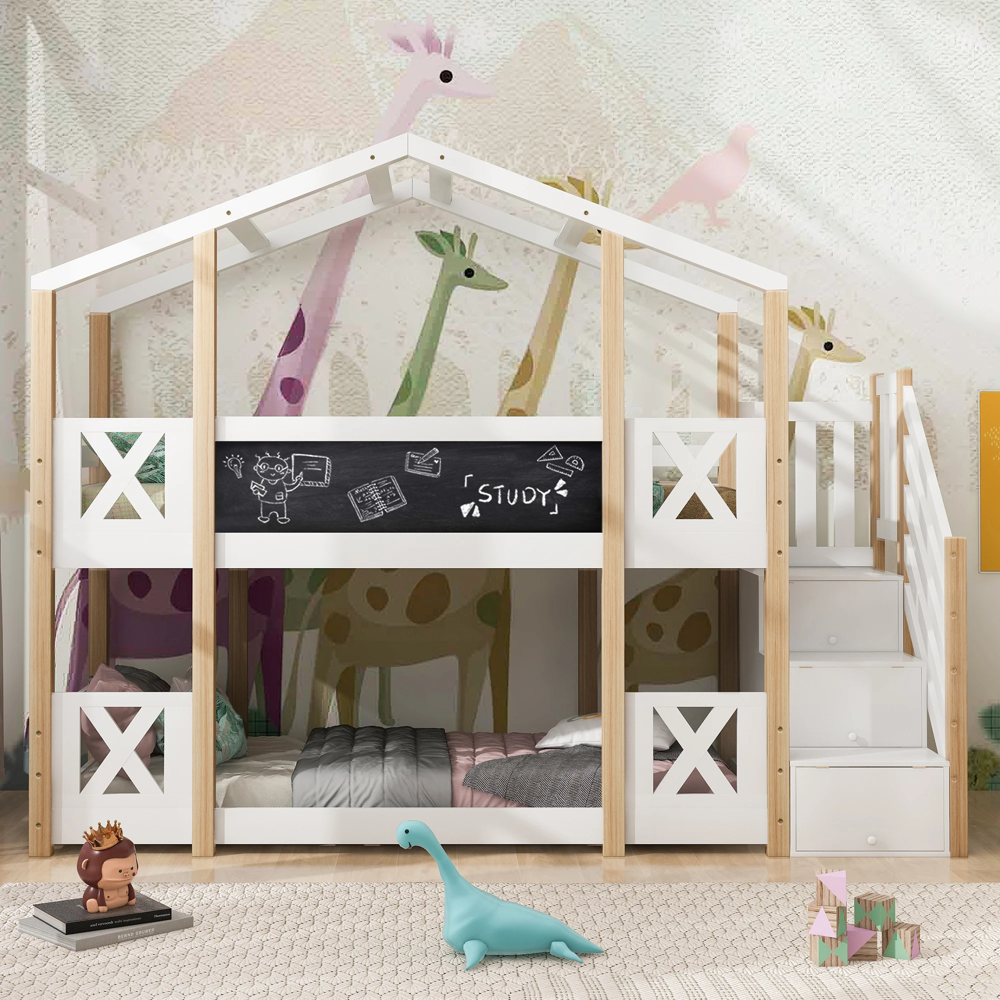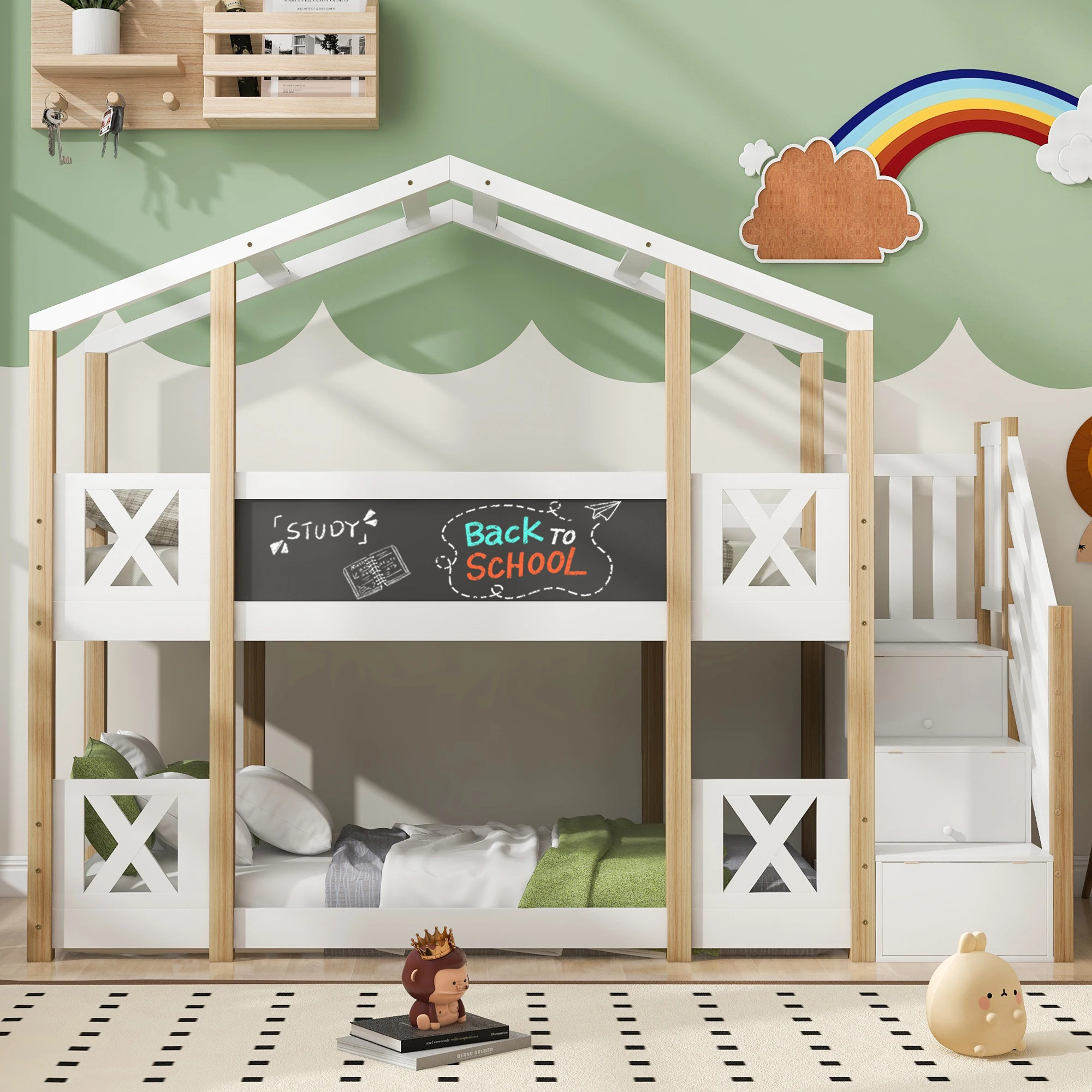 ↑90x cm kinderstapelbed, huisstijl, trap, opberg- en valbeveiliging, natuurlijke drank en wit - TopDealBox