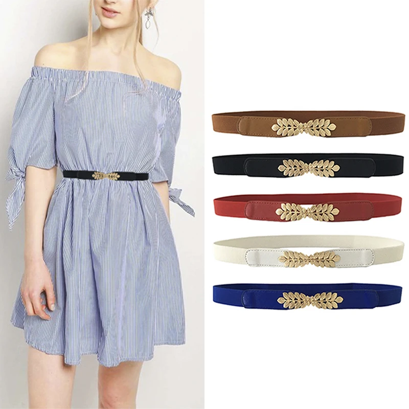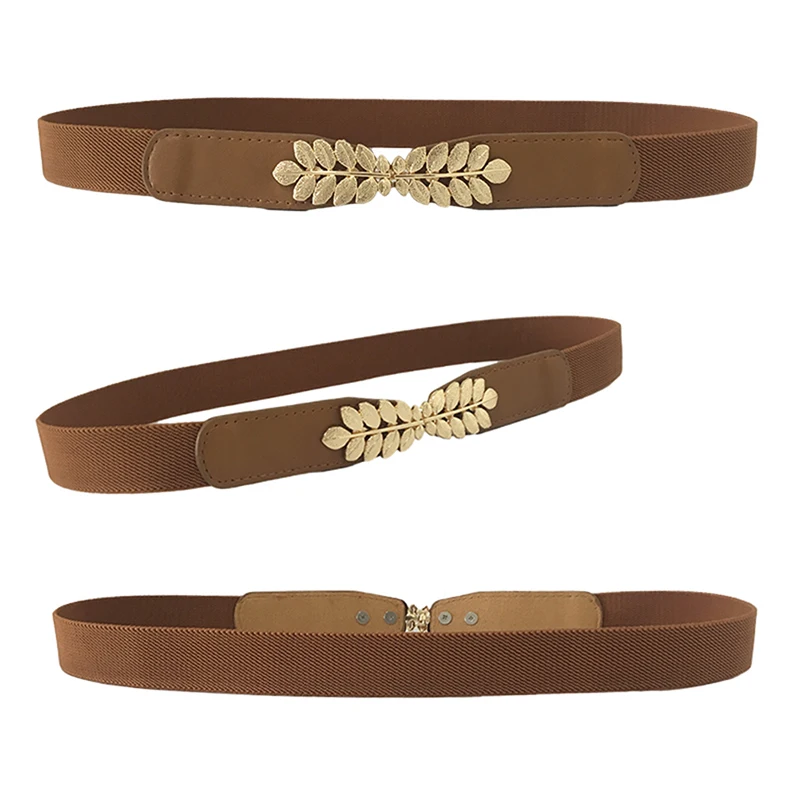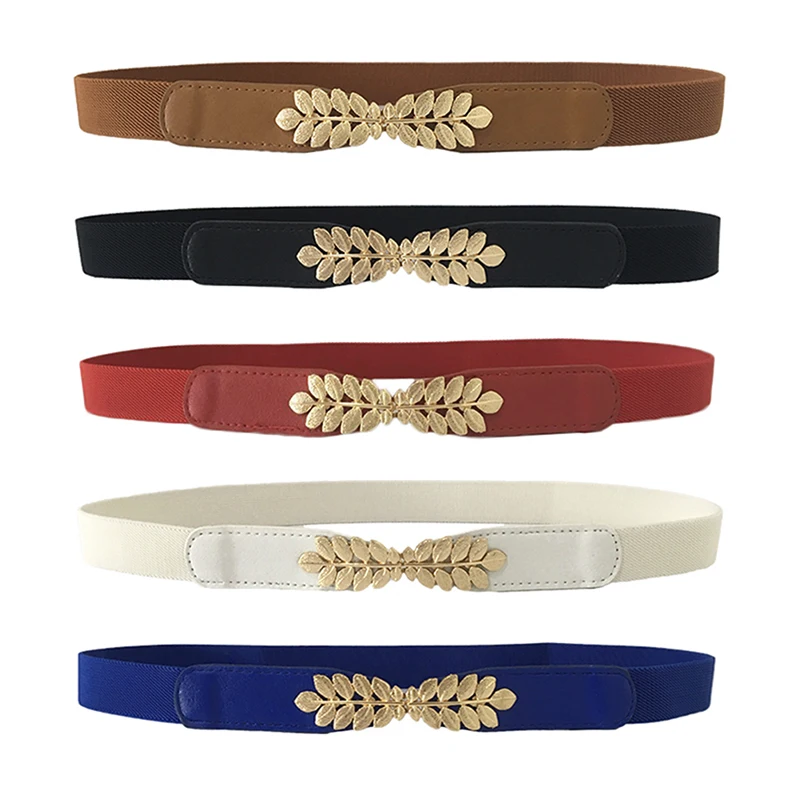 ↑Mode Blad Taillebanden Rekbare Dame Hot Elastische Cummerbunds Voor Vrouwen Donkerblauwe Riem Jurk Goud Dubbele Metalen Gesp Tailleband - TopDealBox